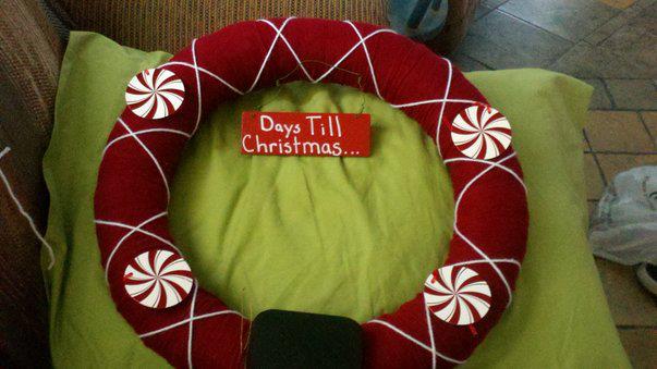Stuff I used: 18 inch wreath form, red/white yarn, peppermint gift tags, one red sign and one hollow cardboard sign, chalkboard paint, foam brush, hot glue, scissors (n i think thats all) oh and white paint pen